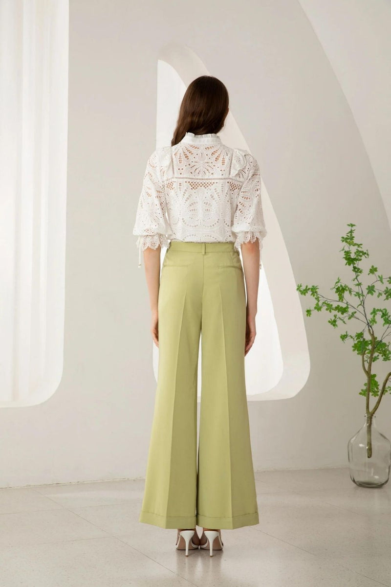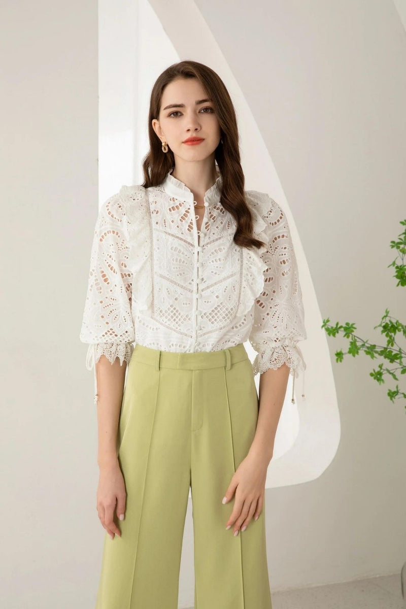 Step into elegance with the Margot Cotton blouse, exuding timeless charm with its intricate eyelet detailing. The blouse features ruffles in the front, creating an extravagant and affluent look.