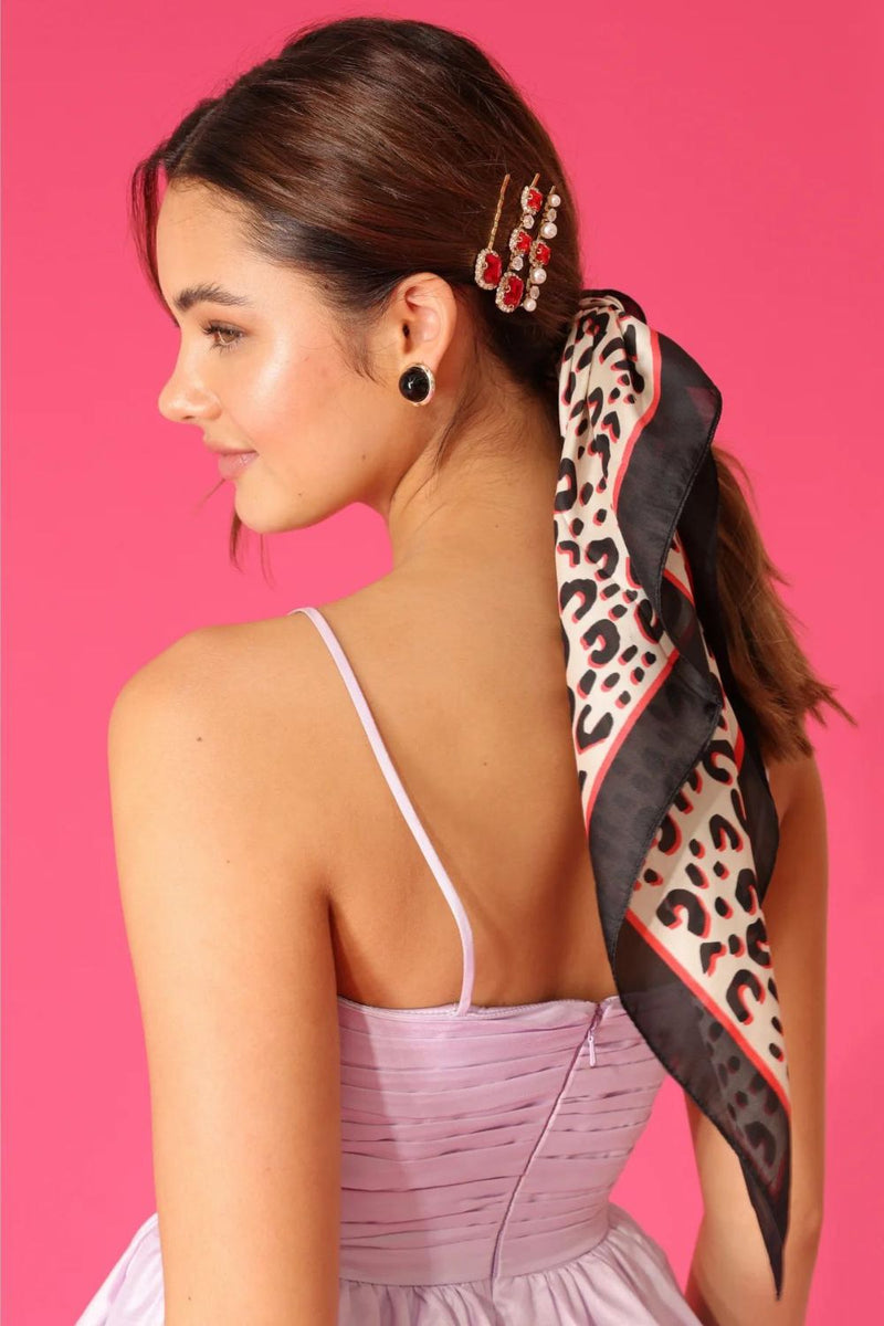 The Morgan & Taylor Antoinette Hair Clip Set in red, is an ornate clip set with antique touch. This stand out set can be used for occasion wear styling or can be used to elevate an everyday look. The well-made clips can be easily applied to various styles, while securing firmly, ensuring a comfortable fit throughout the day. The perfect, luxe clips complimenting many forms of personal style.