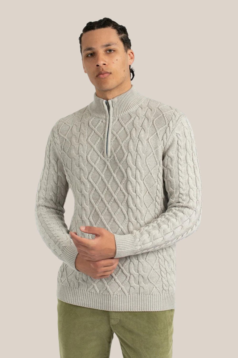 This chunky cable knit zip neck jumper nods to a weave traditionally sported by fisherman which has become a contemporary staple. The high ribbed zip neck makes a tidy sillouette. Team with natural chinos and white trainers for neutral styling