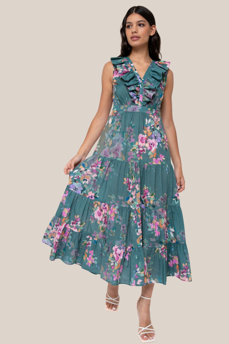Embrace the allure of the Celeste Maxi Dress by Kachel and let it transform you into the center of attention at any occasion. With its frilled V-neckline, sleeveless design, decorative tie detail, tiered maxi length, and lightweight textured fabric, this dress is a true embodiment of elegance and style.