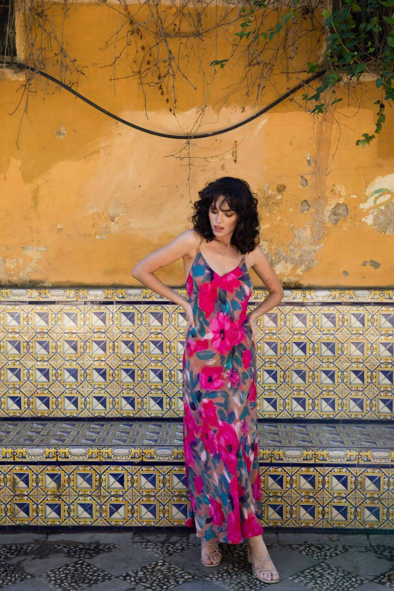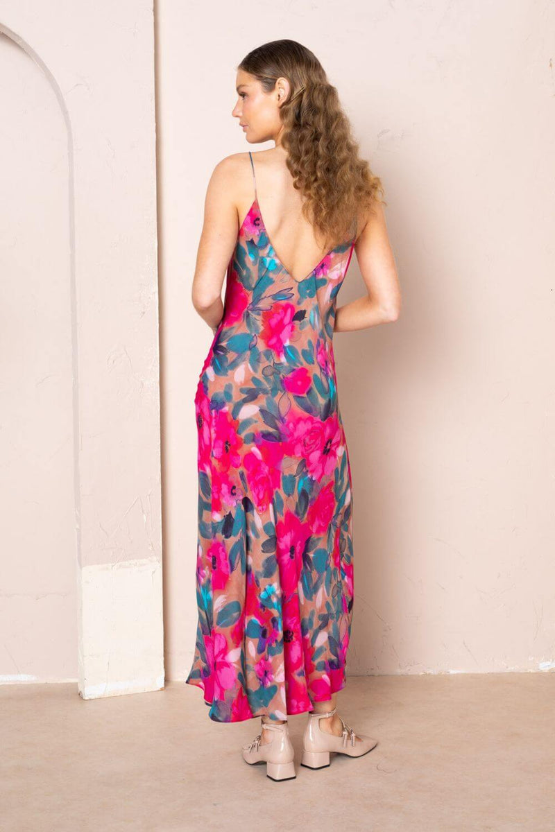 Introducing the Marilyn Maxi Slip Dress by Kachel. Sleeveless and effortlessly chic, this pull-over style boasts a maxi length with thin shoulder straps. The V-neckline in front complements the deep V in the back, creating a timeless silhouette.