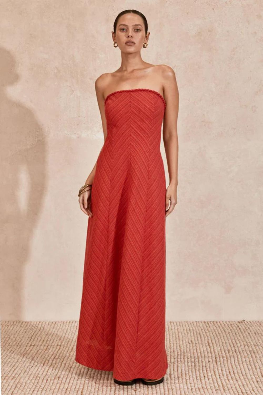 The Celine Strapless Dress in magenta orange boasts a true strapless a-line cut maxi dress silhouette with a chevron bias stripe. Cut from a cotton linen blend, the Celine strapless dress is perfect for your next occasion.