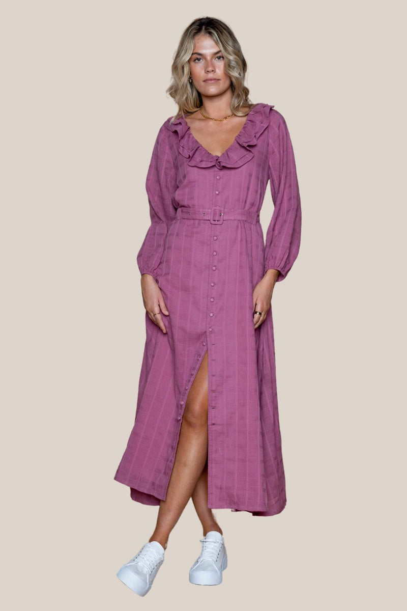 The Silent Echo Hannie Midi Dress is a stunning dress with a frill v-neckline, long puff sleeves, and a button down front. Button down all the way or leave a bit open for an elegant leg slit.