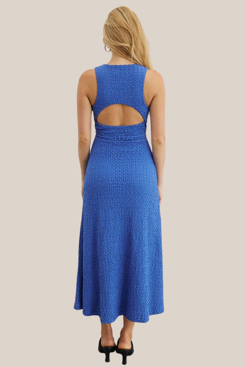 This open back midi dress boasts a classic silhouette. The Frequency Midi Dress features a deep V neckline with a fitted bodice and flared skirt.