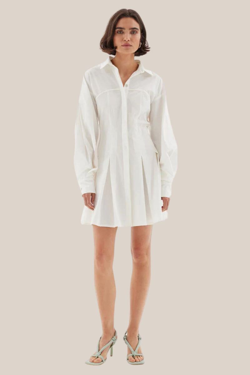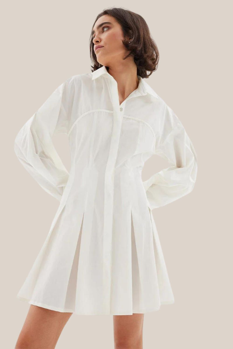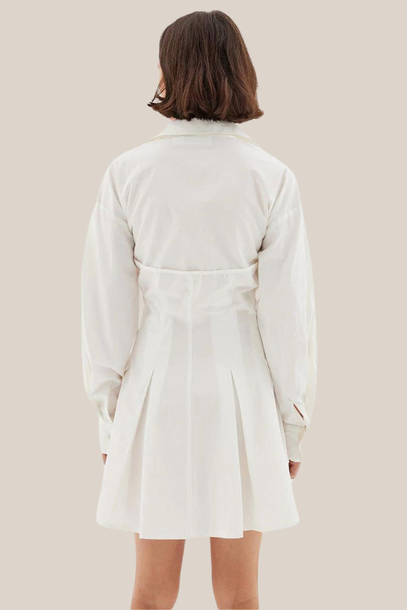 The Override Shirt Dress features a long sleeve mini length shirt dress silhouette. Designed with a flattering collar and stand neckline, oversized long cuffed sleeve and a fitted waist.