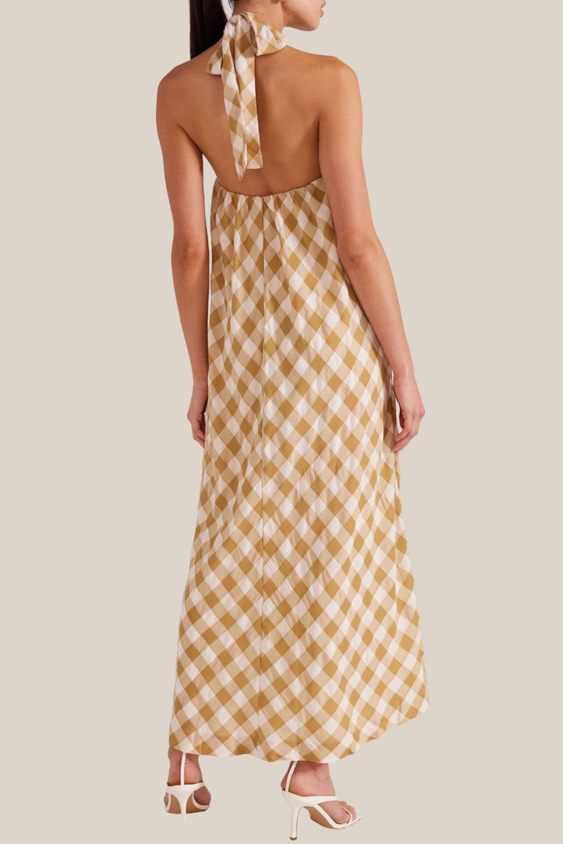 The Arlo Halter Midi Dress by Staple the Label is crafted with a fresh, beige & white gingham print. Pair with a simple heel to dress the garment up, or wear casually during the day with a neutral slide.