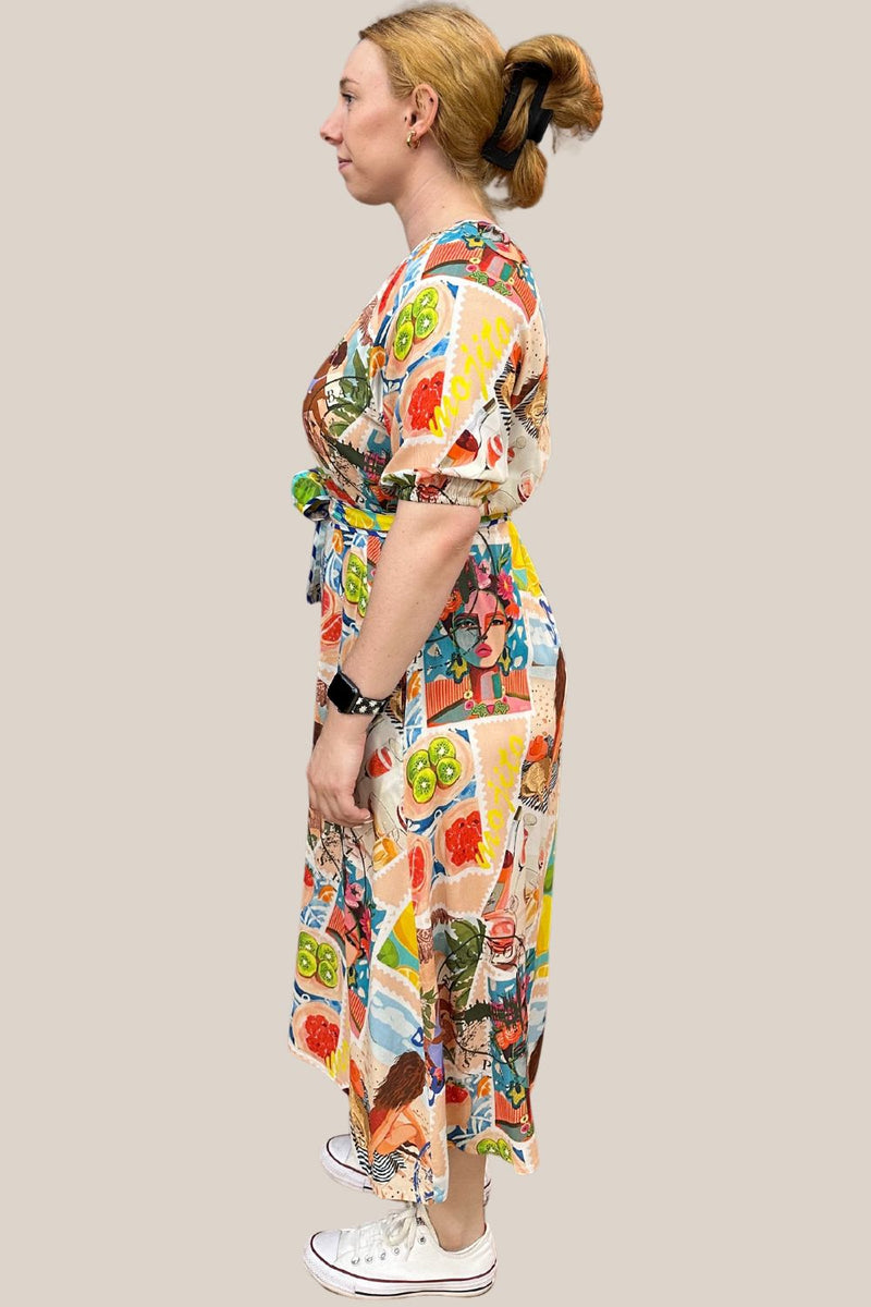 Feel like you are on a tropical island all day long in the Collectivo Stamp Print Belted Midi. This v-neckline dress can be worn with or without the matching belt and can be easily dresses up or down, depending on your occasion.