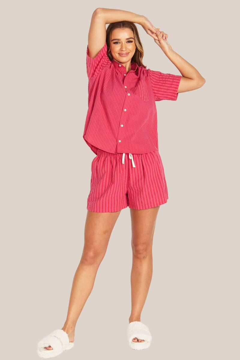 Feel comfy all night long in the Sass Indie PJ Seperates Set. This beautiful pink and magenta stipe top and shorts set needs to be added to your PJ collection!