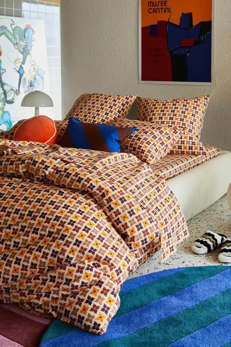 • “Our Florencia cotton bed linen pays homage to interior trends and colour palettes of the 1970s. Warm earthy hues and multi-coloured dots combine in a playful floral geometric print reminiscent of retro wallpaper. Complete the look or layer print on print to create a sophisticated eclectic aesthetic.” – Phoebe’s Style Notes