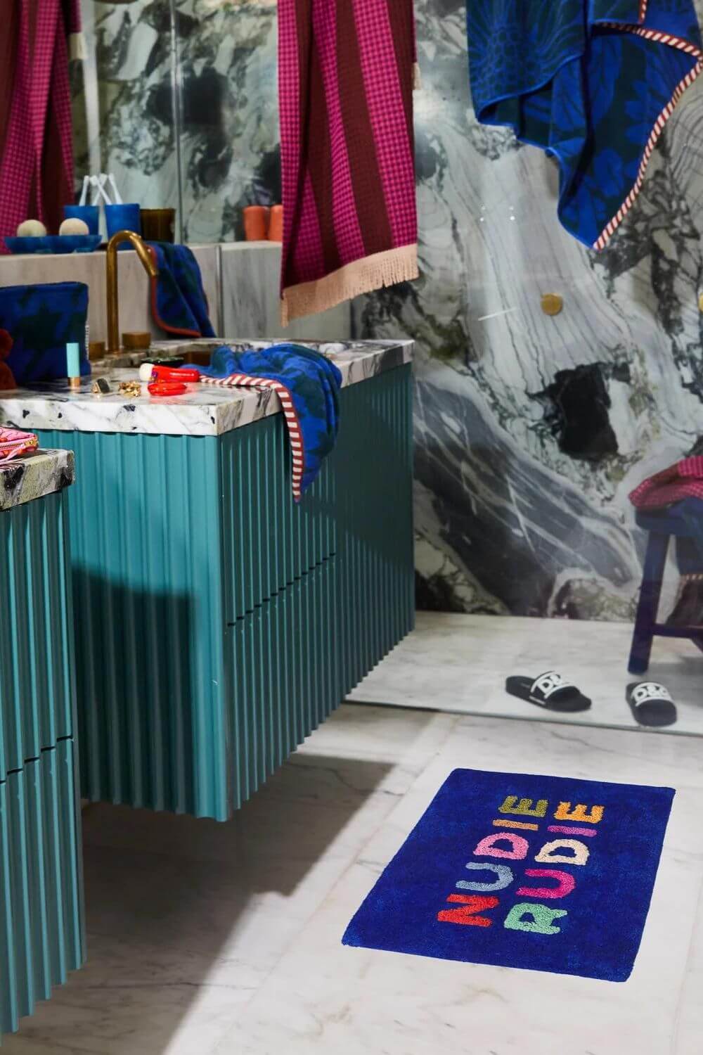 • “Multiple fresh and rich colours lend an extra-uplifting feel to our cheeky and iconic Nudie Rudie slogan. This practical and playful mini design is made to bring a smile to your face every time you step out of the shower.” – Phoebe’s Style Notes