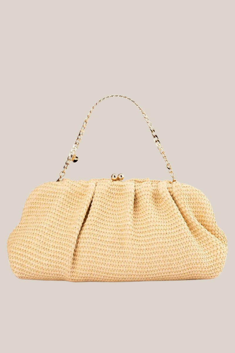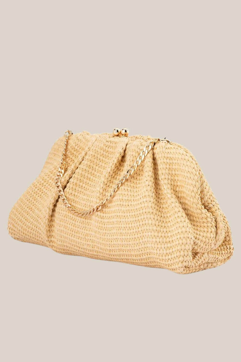 The Queenie Woven Clutch is crafted for an elegant and timeless look. The textural finish adds a playful touch, making it the perfect blend of sophistication and fun. It's versatile enough to dress up any ensemble, from a casual outfit to a formal attire. Let this stylish bag be the finishing touch for your next event.
