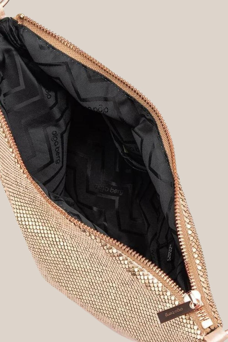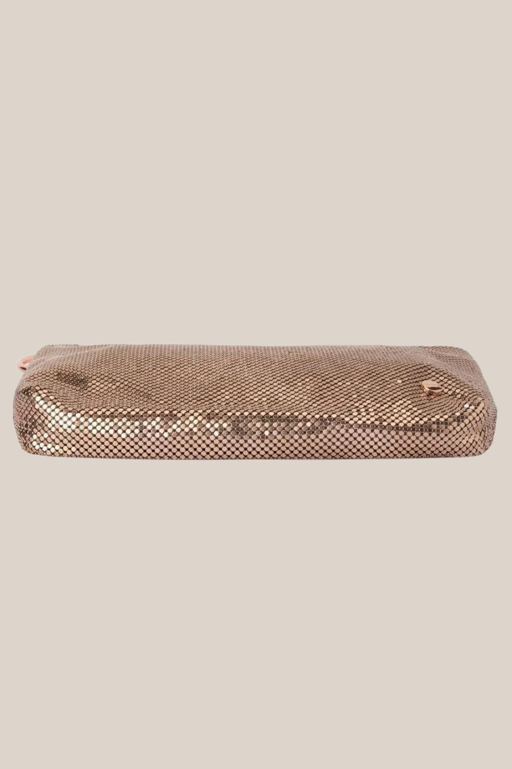 Carry the Shar Mesh Rose Gold Bag to hold all your essentials and add a touch of glamour to your outfit. Featuring a metal mesh exterior, this rose gold evening bag is soft and slouchy and has a zipper closure to keep your essentials secure. This beautiful rose gold bag also includes a long chain to transform this multi-tasking bag into a cross body; perfect for a festival or a casual weekend brunch.