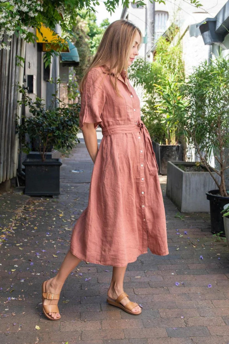 The Geneva dress is a midi length linen dress with pleats and bell sleeves finished with a self fabric belt. This stunner needs a pair of neutral sandals for the perfect casual look or heels and a matching clutch for a night time look.