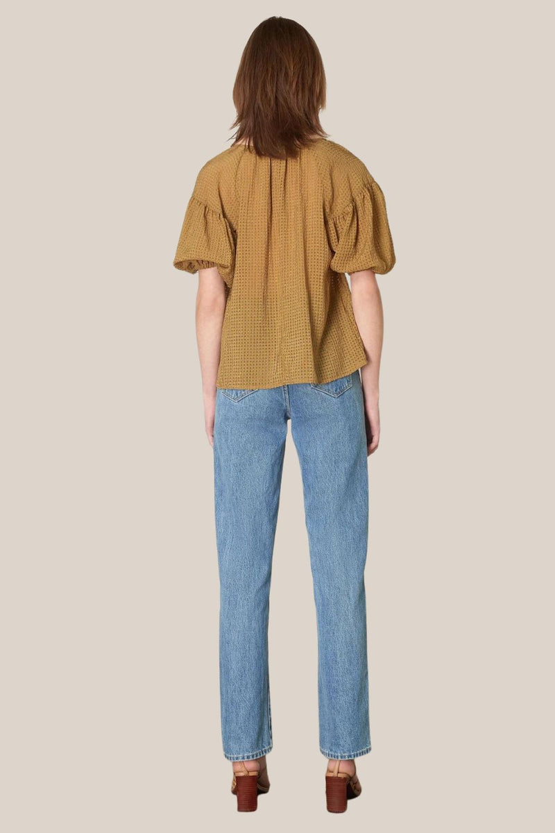 The Esmaee Theodra Blouse is a beautiful moss coloured top that featues a V-neckline, short puff sleeves, and a button down front. Team this with your favourite jeans for a casual look or linen pants and heels for a dressier look.