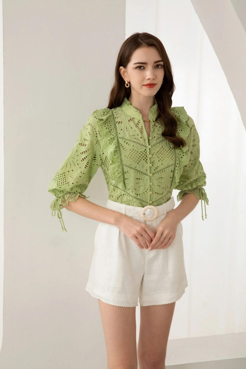 Step into elegance with the Margot Cotton blouse, exuding timeless charm with its intricate eyelet detailing. The blouse features ruffles in the front, creating an extravagant and affluent look.