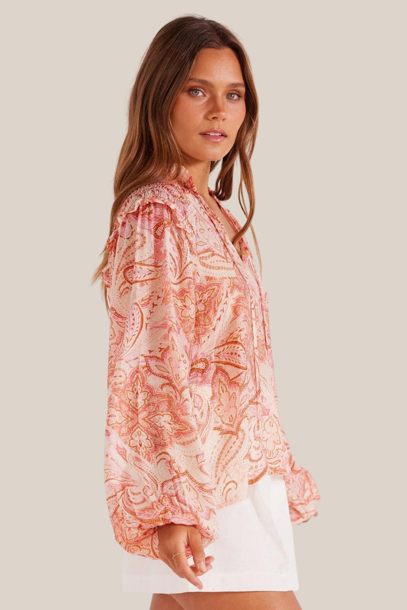 MINKPINK Katniss Blouse is a v-neckline top with shirred shoulder details in a floral paisley print. This relaxed fit top is semi-sheer and teams perfectly with a pair of shorts for casual wear or can easily be dressed up with a set of heels and lippy. Add to your wardrobe today.