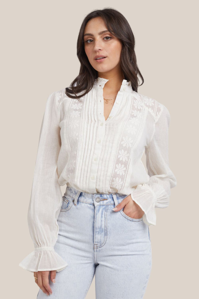 It's all in the details. The All About Eve Louisa Top is a button up top with long sleeves, statement frill cuffs, and pleated front. The floral design adds the perfect touch to an already stunning blouse.