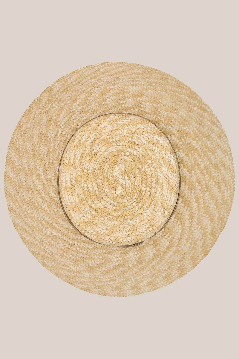 • Wide-brim boater with elegant trim around the crown