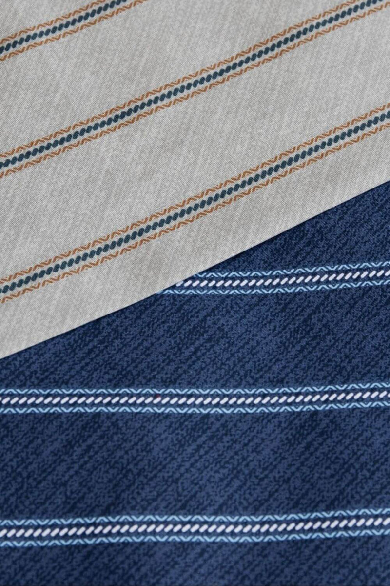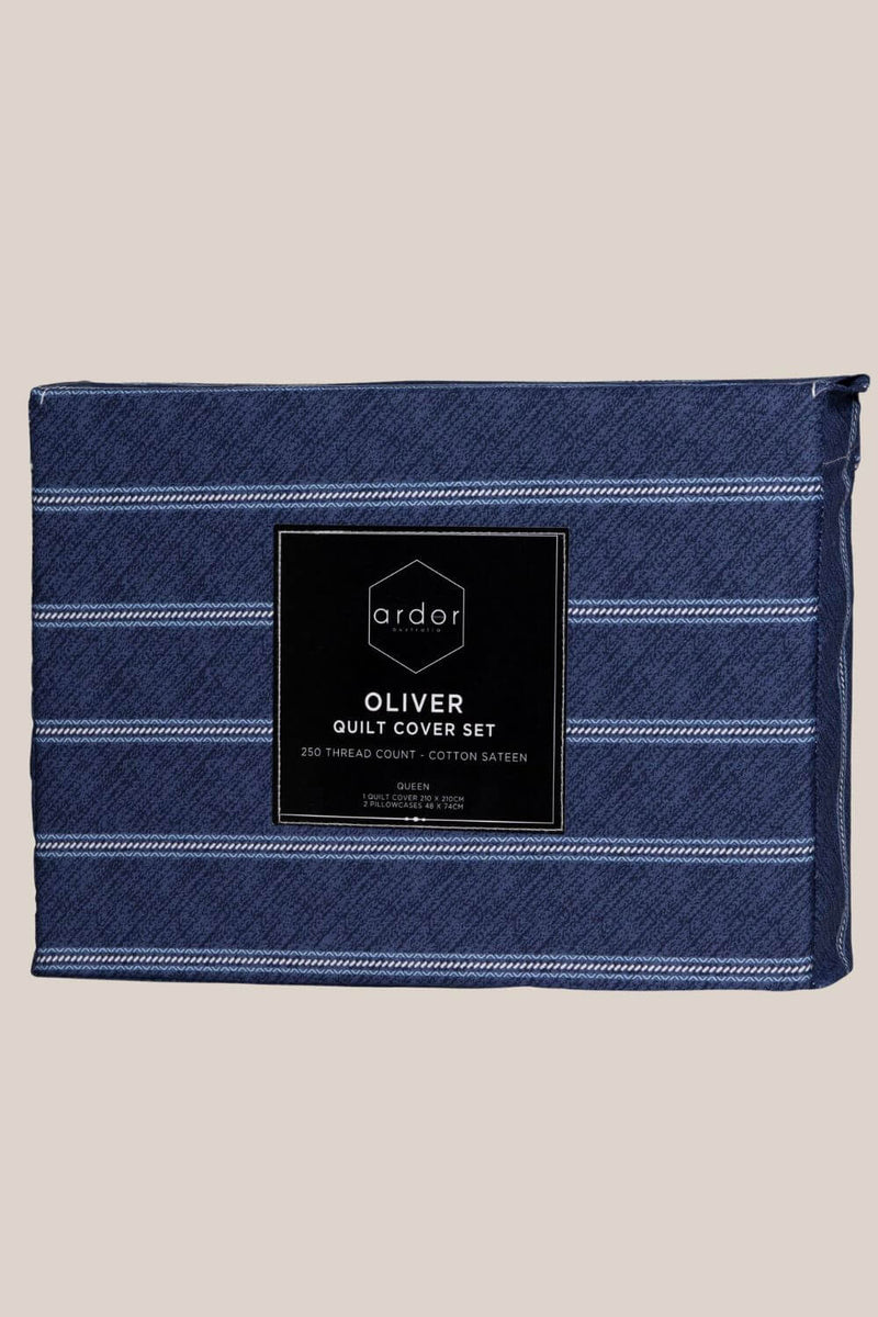 The Oliver quilt cover set in deep navy, layers textural grey stripes to create a subtle pattern. This design adds depth and sophistication to your space, with it’s understated textures and soothing grey reverse.