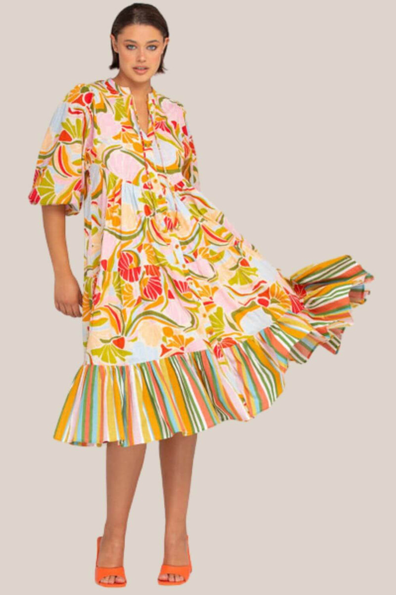 The Boom Shankar Mabel Dress is a 100% cotton, midi-length dress with signature Boom splicing. This dress has lots of fun details with elasticated 3/4 balloon sleeves and neckties.The Mabel Dress is fitted across the chest and shoulders with a loose and fuller waist and skirt. It has a V-neck with a stand collar and neckties. The sleeves are more floaty and puffy.