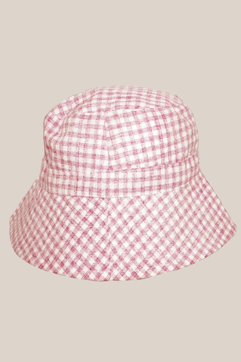 A soft to touch cotton bucket in a pink or blue check design. It has an inner cotton lining in the crown of the hat for full sun protection
