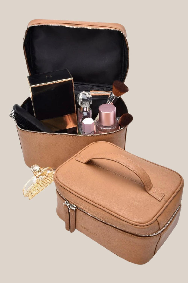 Small size full grain leather beauty cases with top carry handle. Sleek, not overcomplicated, to carry makeup, beauty items, jewellery and accessories.