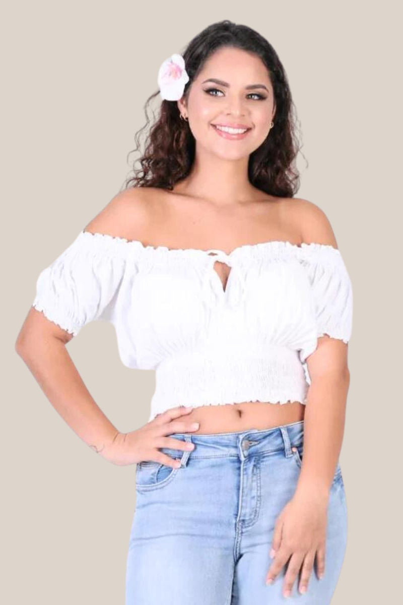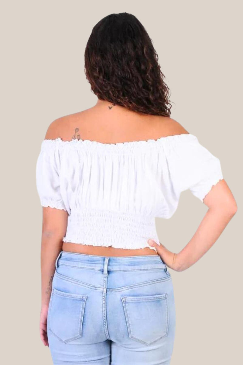 The Go Girl off the shoulder peasant top is a sweet cropped style with its elastic rouching around the hem & a self tie neckline. This top can be worn either on or off the shoulder & looks great paired back with any denim jeans or skirts.