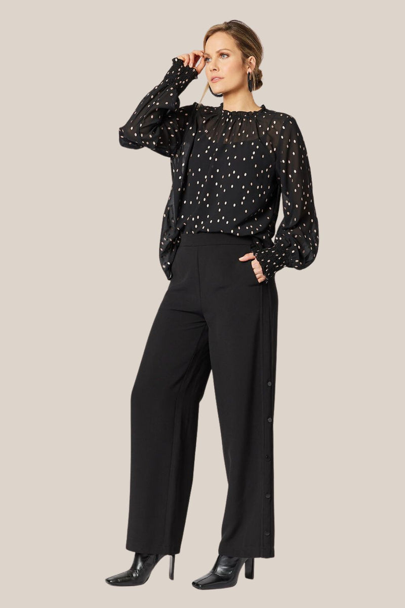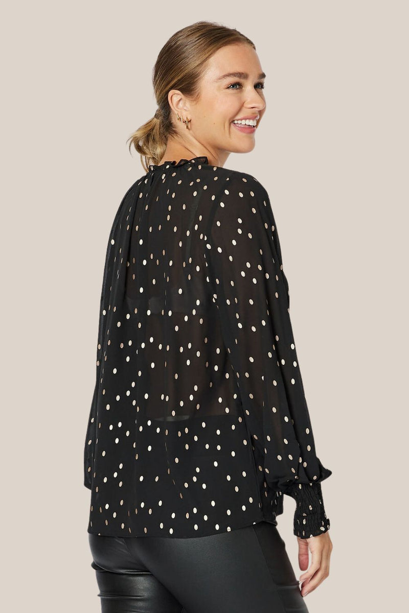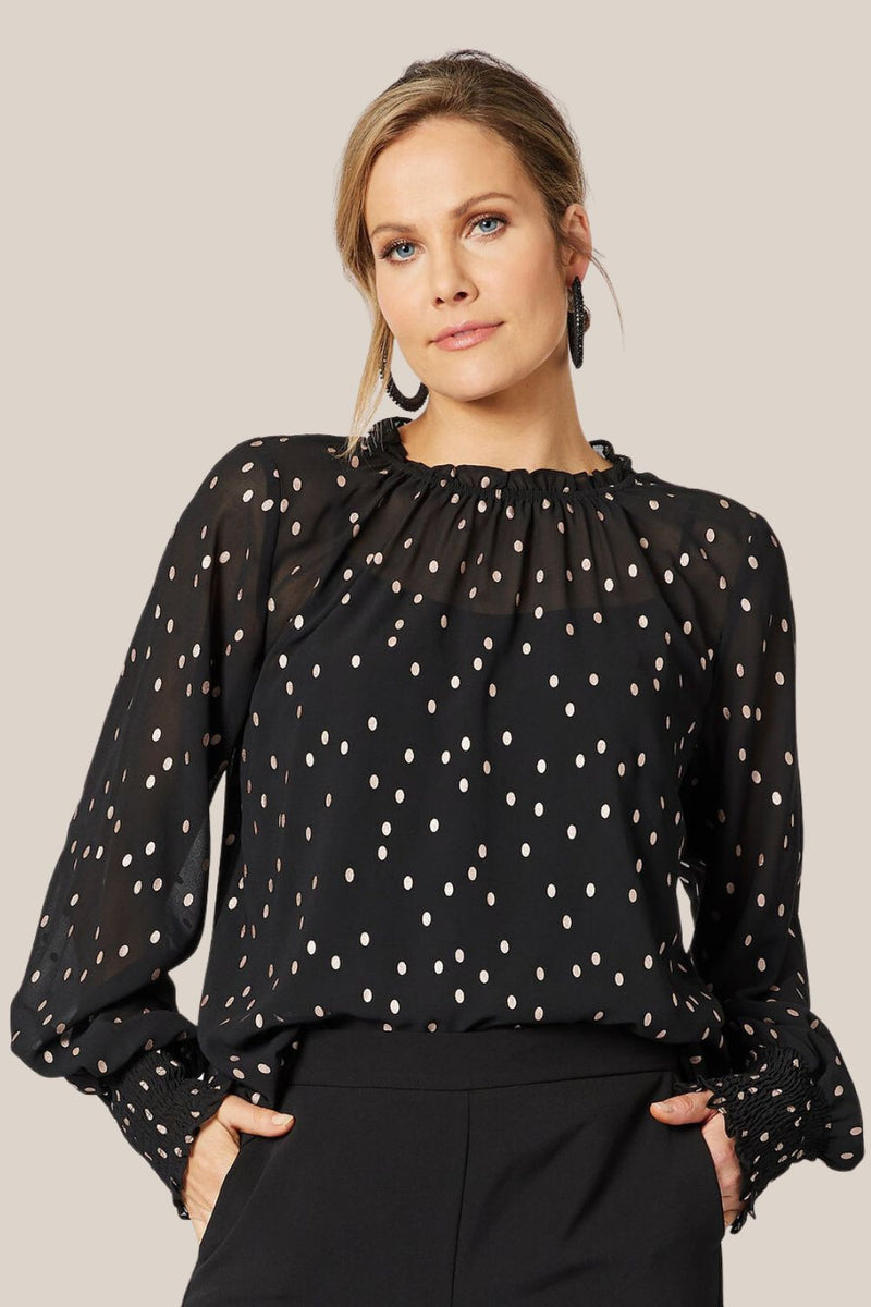 The Hammock & Vine Bronze Spot Top is a round neck, long sleeve blouse that adds a touch of elegance to every outfit. Perfect for a work outfit with black pants and heels.