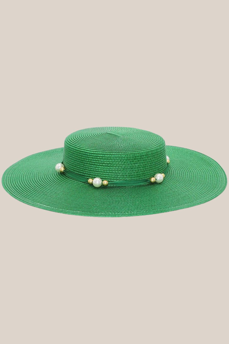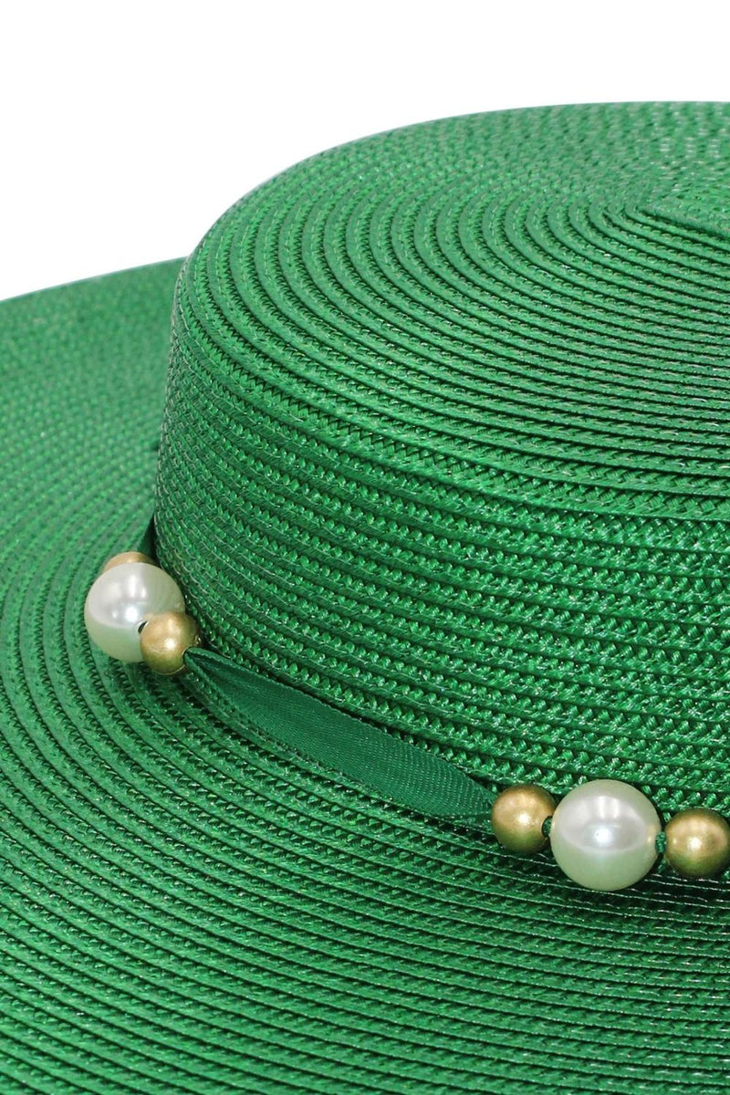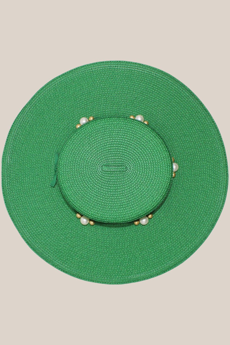 The Morgan & Taylor Elowen Boater in emerald features a classic boater shape with bold gold and pearl beading along the crown. The structured and lightweight design makes it easy to style for multiple occasions.
