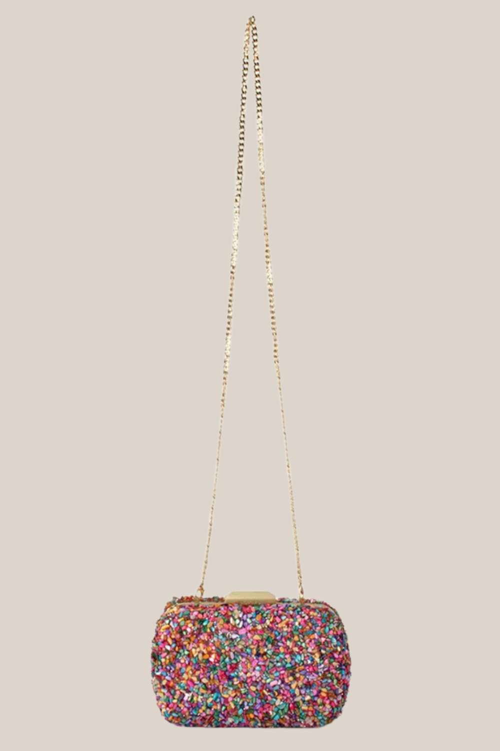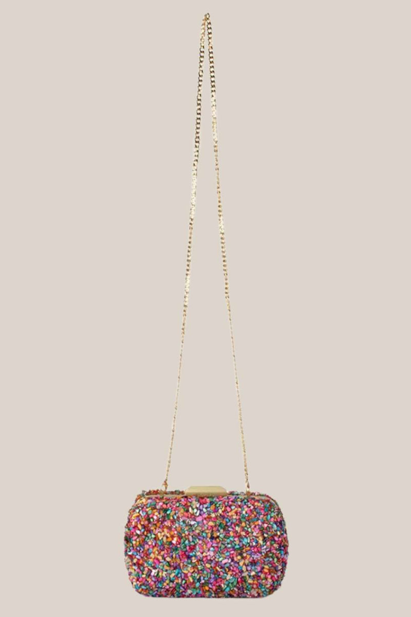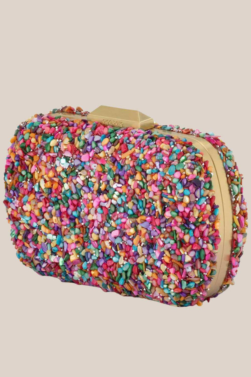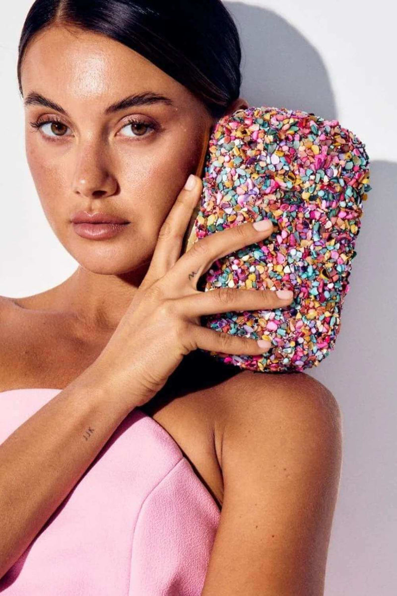 The Savannah Pebble Clutch is a stunning blend of texture and style, featuring beautiful tiny pebbles that create a playful yet sophisticated aesthetic. Perfect for adding a touch of charm to your outfit, this bag is as unique as it is eye-catching! This clutch comes with a removable shoulder chain that tucks inside when not in use.