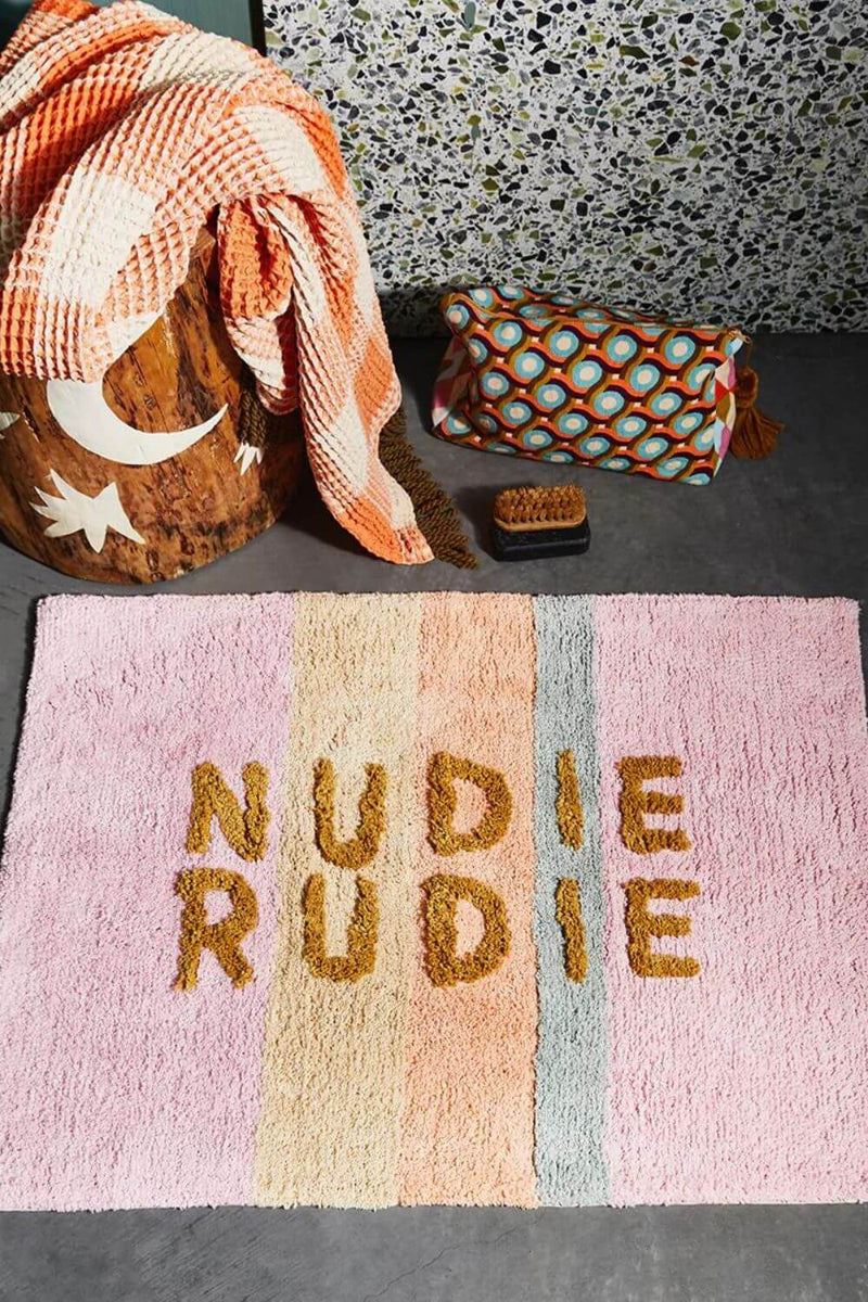 Sage X Clare's most popular product ever, the Tula Nudie Bath Mat, adds a daily dose of fun to any bathroom thanks to the cheeky 'Nudie Rudie' text adorning its tufted base.