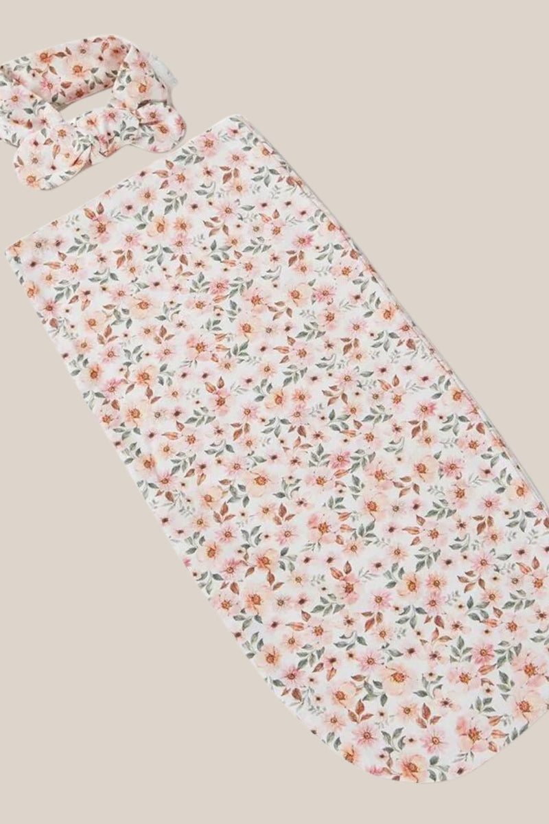 The Organic Cotton Jersey Snuggle Swaddle in Spring Floral is soft and stretchy, and has no zips or velcro. It comes with a matching topknot. Featuring the exclusive Spring Floral design it is made for newborns to 3 months. Perfect for birth announcement photos this makes a great gift for baby showers or a newborn baby.
