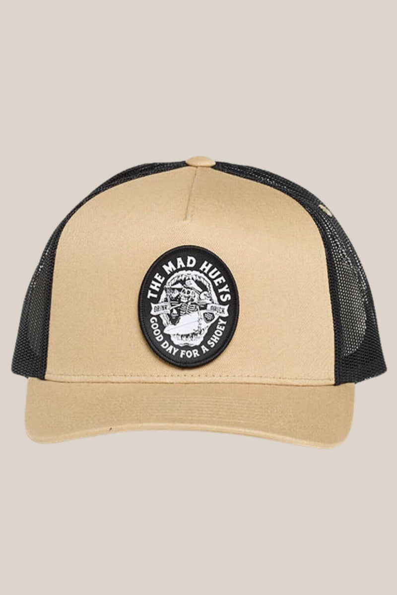 Get wild with The Mad Hueys' Shoey Jaws Twill Trucker in tan! Crafted from premium materials, this cap offers maximum comfort and style for your outdoor adventures. With its unique skeleton doing a shoey in the jaws of a shark graphic, it's sure to turn heads.